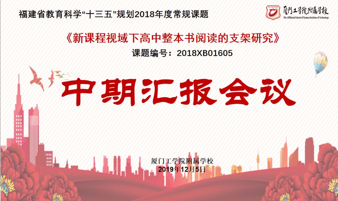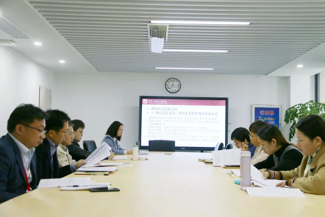 12月5日上午,我校语文组省级课题《新课程视域下高中整本书阅读的支架研究》中期汇报会在行政楼一楼会议室举行,福建省语文学会副会长、省高中新课程语文学科专家指导组成员俞发亮,全国小学语文教学研究先进个人、省优秀教育工作者周志高,我校总副校长、省级特级教师黄亮生,教育教学中心主任、本课题组组长王玉君以及课题组全体成员出席会议。会议由课题组组长王玉君老师主持。