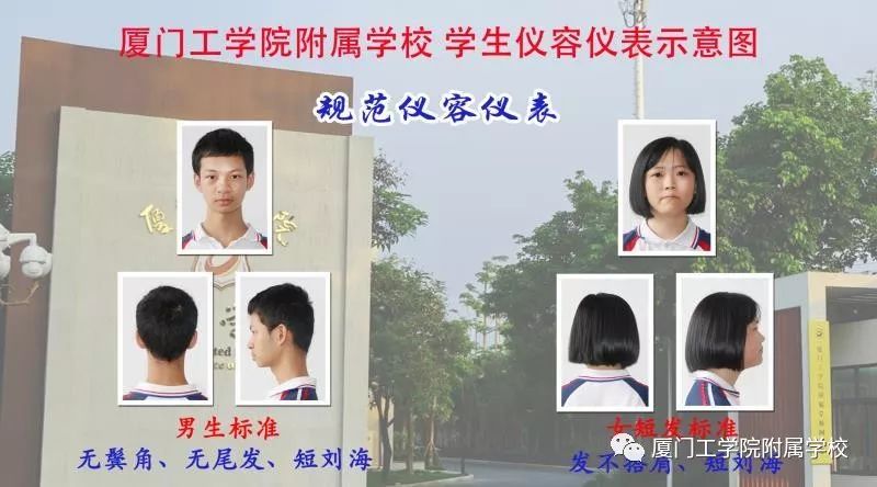 男生发型:前面不得遮眉,侧面不得盖耳,后面不超过发际。不准染发、烫发或其他奇异造型。