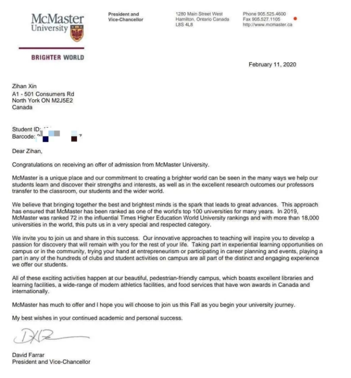 I will enter university in September this year, and right now I have received 5 offers from University of Toronto, McMaster, Waterloo, and Ottawa. Actually, all of these universities are very good and I would like to choose them. But I can only choose one. I have considered their location, their professors’ level, their resources, and also my ability to study. I finally chose the history department of university of McMaster .