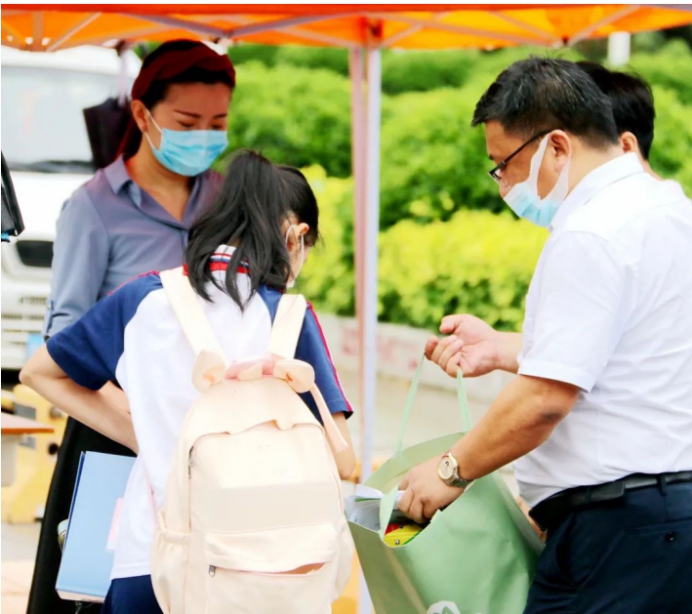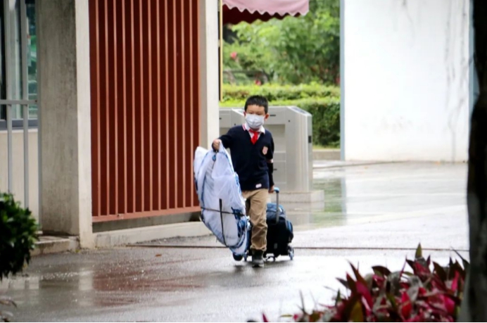 由于疫情防控需要,家长无法进入校园,学校的老师们主动承担起了孩子们的行李搬运工作。