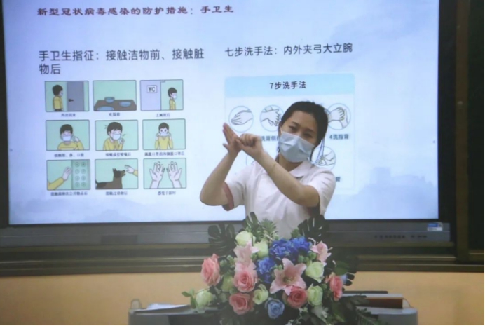 老师教学生们“七步洗手法”,仔细清洁手部。