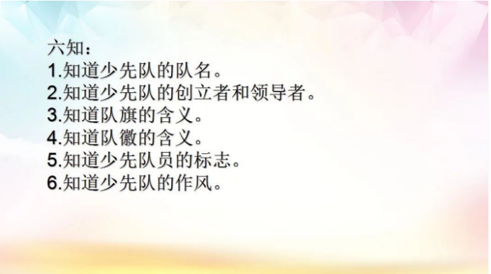 队前培训中,一年级的预备队员们了解了少先队的队名、队徽、队歌,练习了入队誓词和呼号。通过倾听辅导员老师的讲解,孩子们了解了少先队的发展历史,认识了中华人民共和国国旗、少先队队旗、红领巾等等。