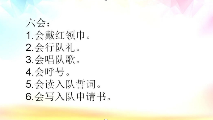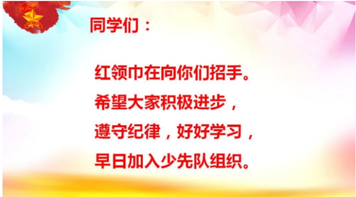 队前教育是加入少先队组织的第一课,我们期待着同学们在星星火炬的指引下,唱响嘹亮的队歌,牢记习爷爷的教导;我们期盼着鲜艳的红领巾飘扬在同学们肩头的那一刻,你们能用实际行动争做时代好队员,争当中国栋梁才!