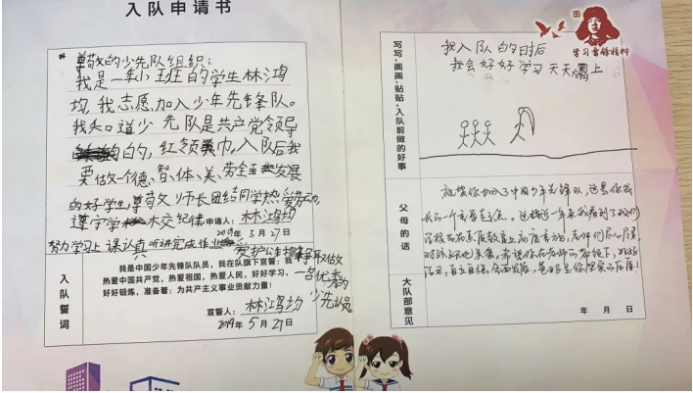 当然,想加入少先队,除了“六知、六会、一做”之外,还需要向我们的大队部提交一份入队申请书哦。在队课上,叶老师向同学们展示了学校的哥哥姐姐入队时的申请书!