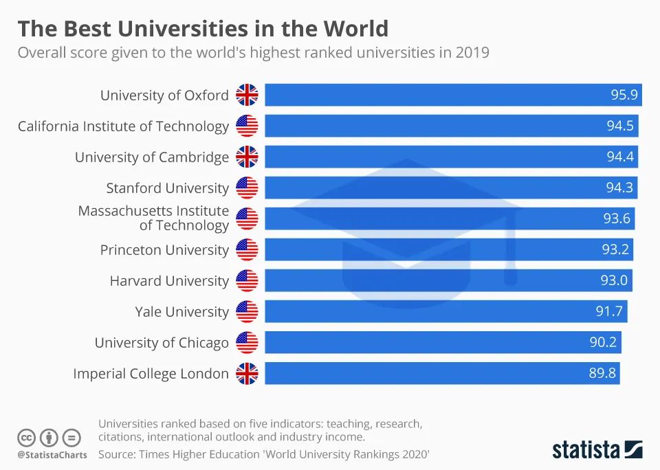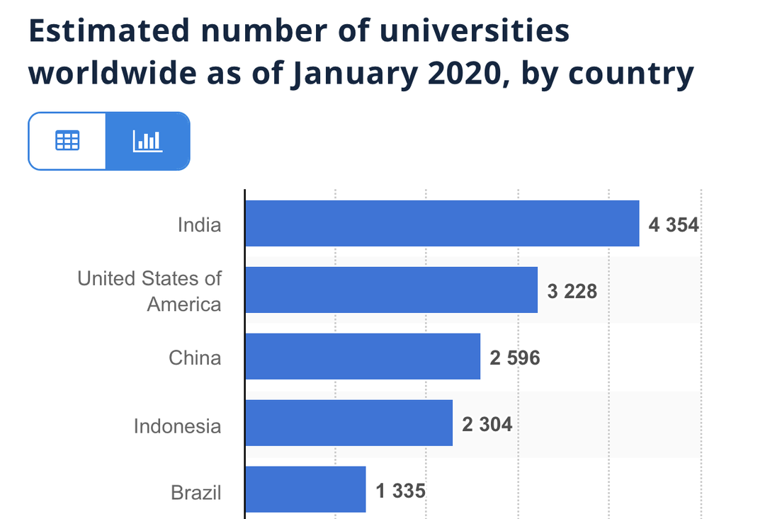 根据中国教育部统计,目前中国境内大学数量总数为两千余所,全球的大学更不胜枚举。根据Statista的官方数据,2020年全球拥有最多大学的国家为:印度,美国,中国,印度尼西亚与巴西五个国家,大概拥有4354,3228,2596,2304,1335所大学,仅美国而言,就拥有三千多所高校。
