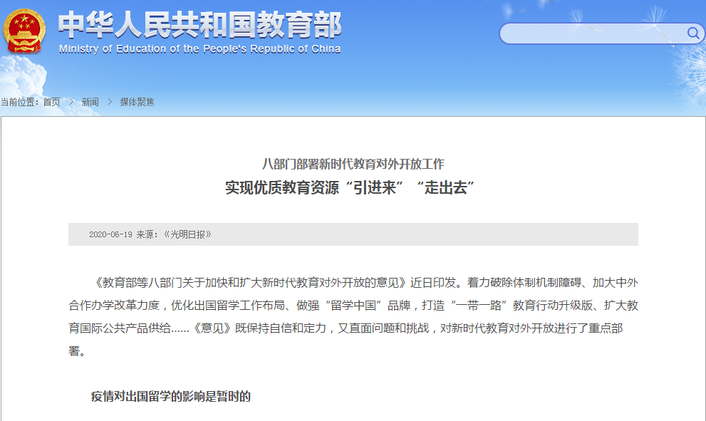 2020年6月18日,我国教育部官网发布《教育部等八部门关于加快和扩大新时代教育对外开放的意见》,以官方途径对近期的一些“留学谣言”进行了澄清。