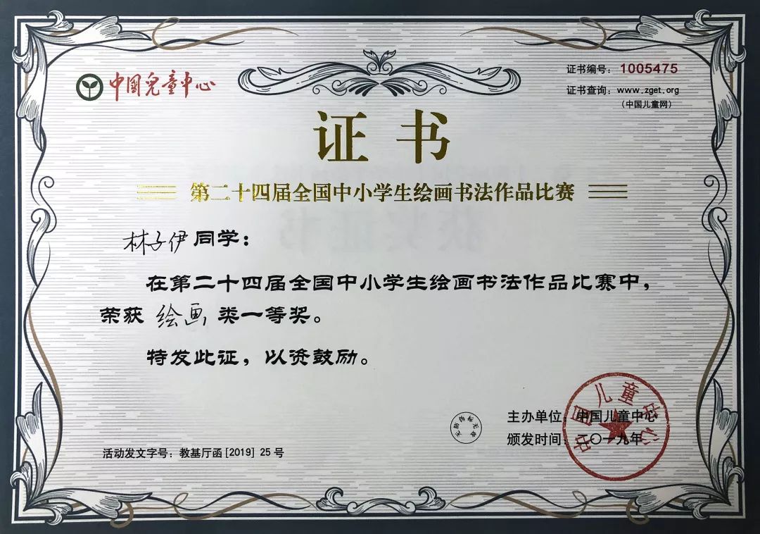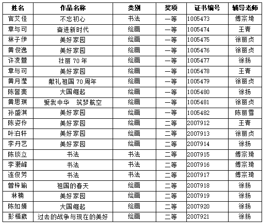 在第二十四届全国中小学生绘画书法作品比赛中,我校学子以多彩画笔绘喜人成就,凭撇捺毫锥书傲人篇章!在本次比赛中,我校共有官艾佳、章与可、林子伊等10位同学荣获一等奖;陈姿伶、叶泊轩、李丹艺等20位同学荣获二等奖;宋朝恩、林梓敏、何玫萱等25位同学荣获三等奖。