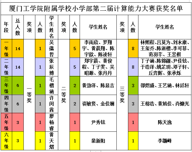 经过激烈角逐,赛后,老师们及时批改了试卷,公平公正地按照选手们的答题快慢、答题正确率、答题规范性评出了一、二、三等奖的同学。其中,一、二年级评选出一等奖1名、二等奖5名、三等奖8名,三、四年级评选出一等奖1名、二等奖2名、三等奖3名,五、六年级一等奖1名、二等奖1名、三等奖1名。详细名单见下表。