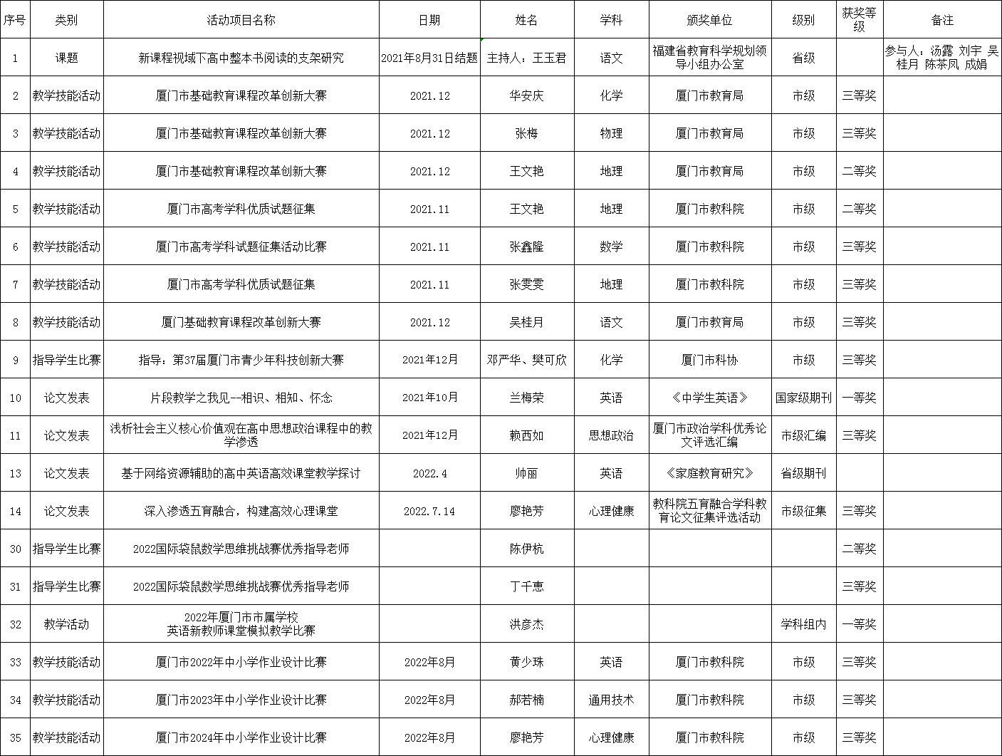 厦门工学院附属学校2021-2022学年高中部教师活动获奖及论文发表统计