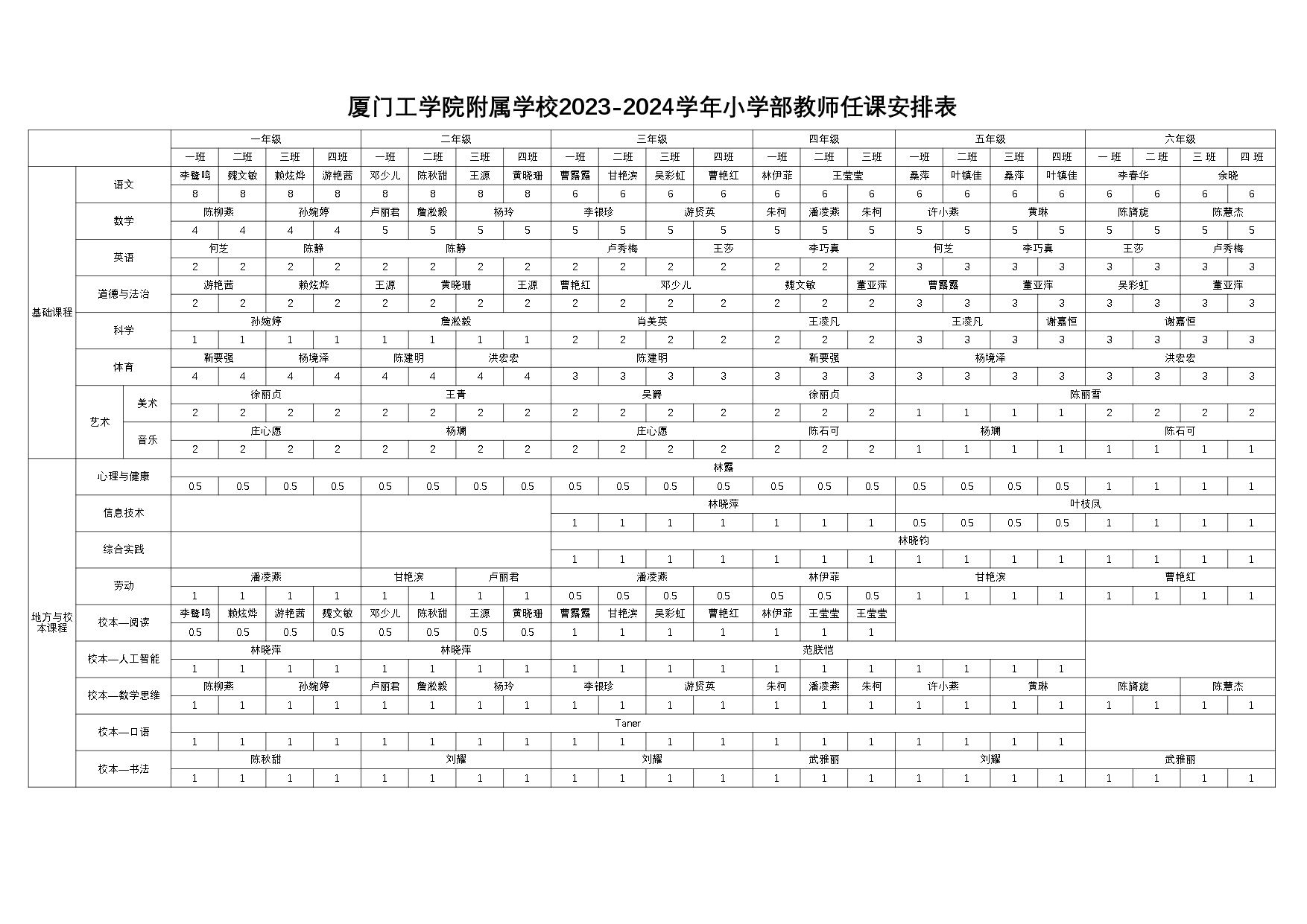 2023-2024学年小学部任课教师安排