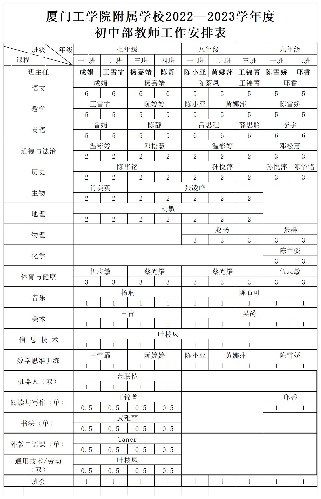 厦门工学院附属学校2022—2023学年度初中部教师工作安排表