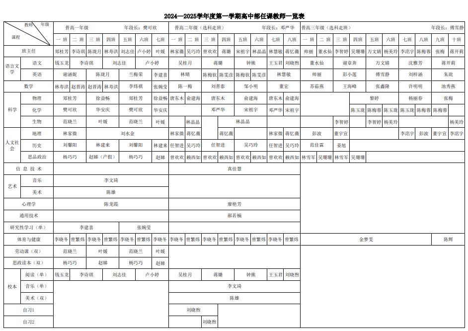 2024-2025学年第一学期高中部任课教师一览表