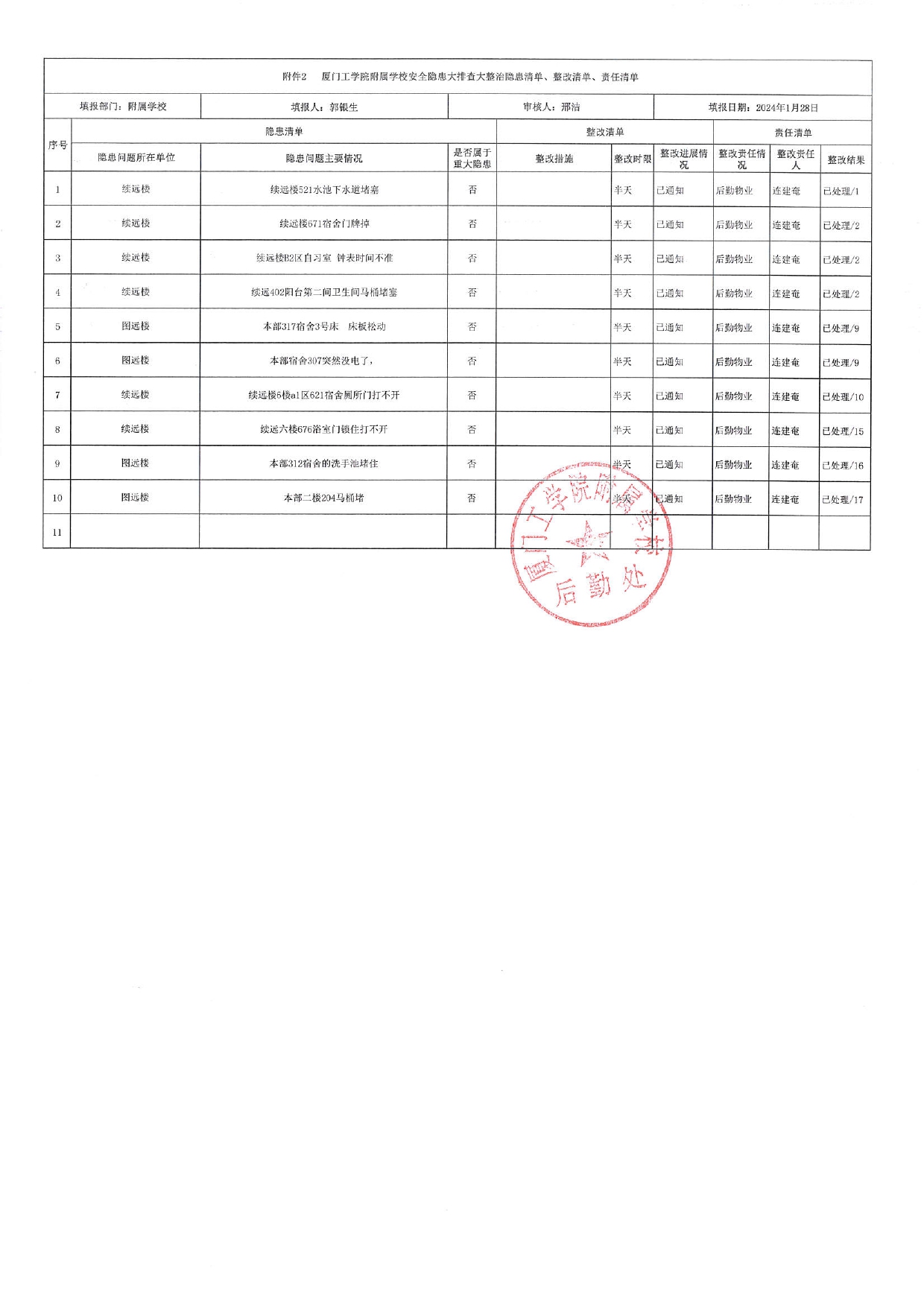 厦门工学院附属学校2024年1月份安全隐患大排查大整治隐患清单、整改清单、责任清单