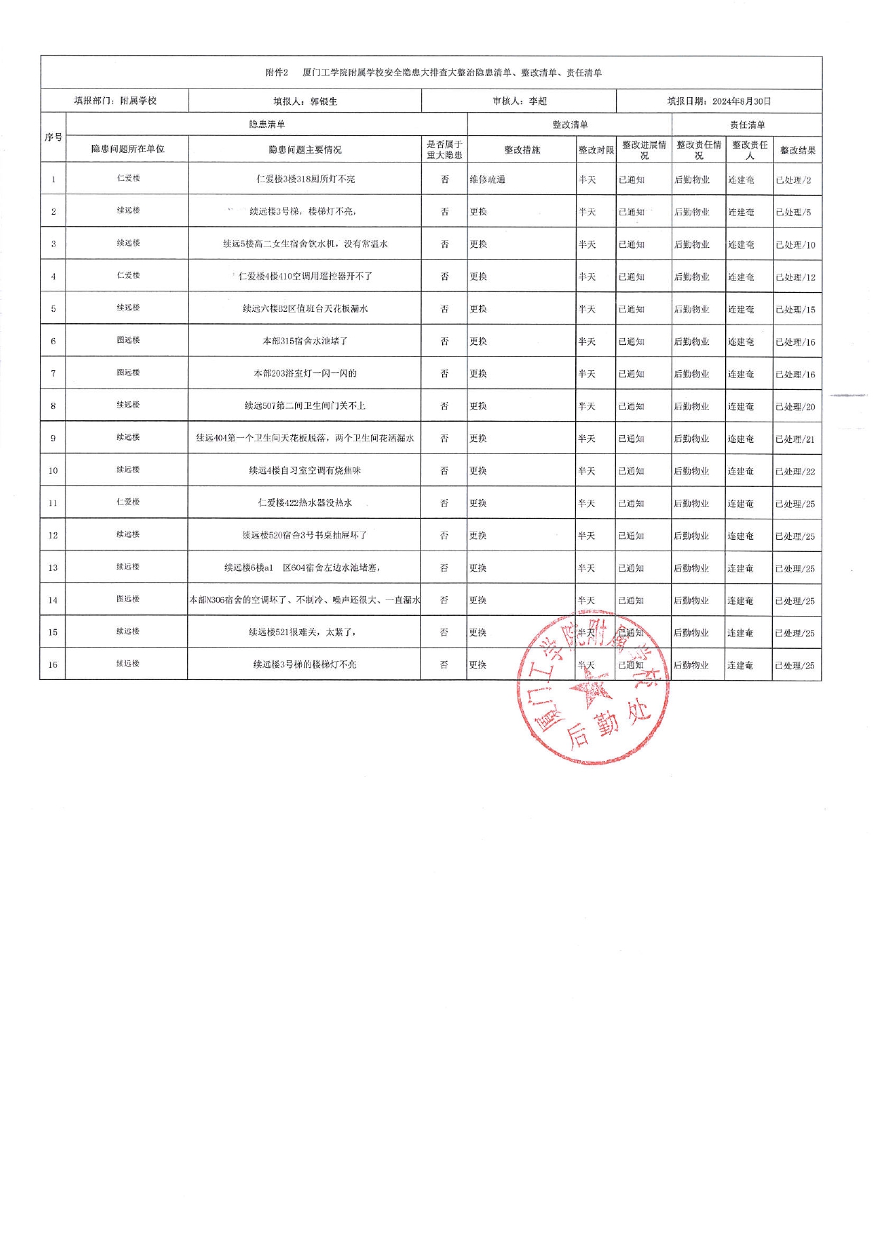 厦门工学院附属学校2024年8月份安全隐患大排查大整治隐患清单、整改清单、责任清单