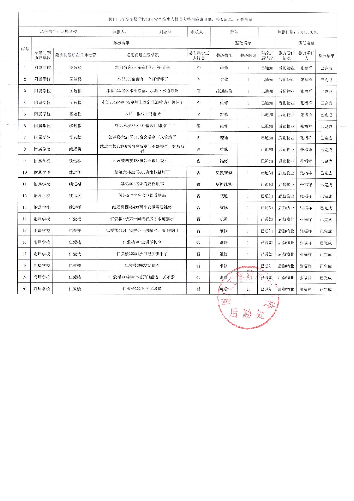 厦门工学院附属学校2024年10月份安全隐患大排查大整治隐患清单、整改清单、责任清单