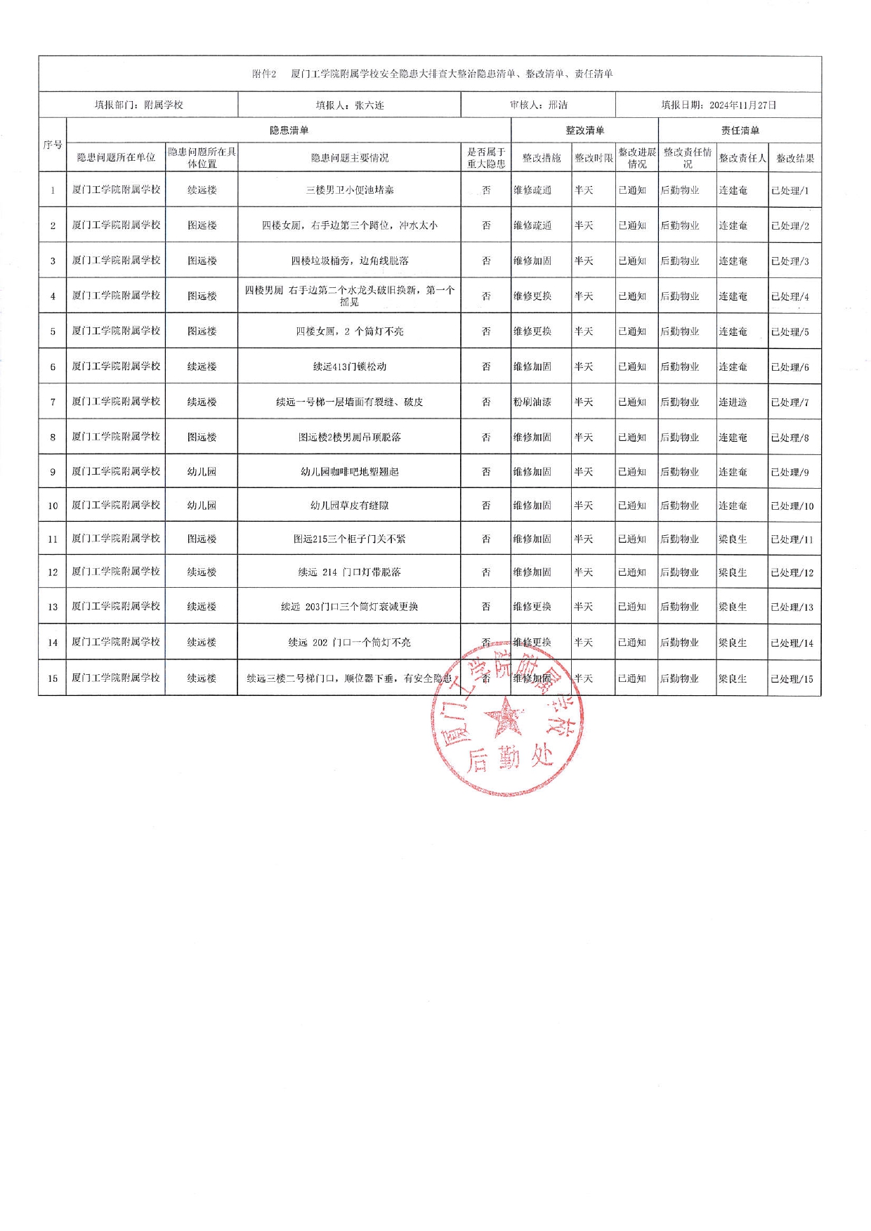 厦门工学院附属学校2024年11月份安全隐患大排查大整治隐患清单、整改清单、责任清单