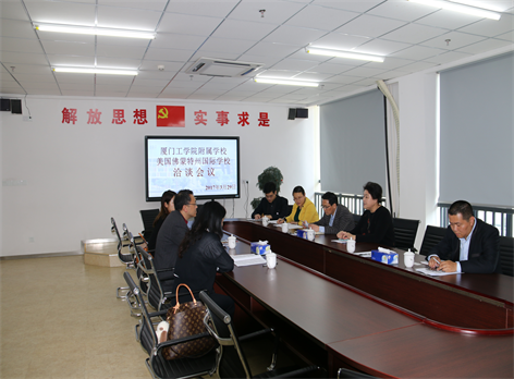 参观结束后,宾主双方在四楼会议室进行了合作办学的洽谈,赵继容校长介绍了我校的办学情况、办理理念等,希望学校能与美国佛蒙特州国际学校在学生培养、教师互访等方面达成合作共识。陈博士一行对学校的盛情接待表示感谢,详细介绍了美国佛蒙特州国际学校的办学优势及与中国多所学校的合作情况。他认为,两校有广泛的合作空间,并可以借助两校的特色打造其合作发展的独特性。双方在洽谈会上就学校的办学资质、招生及市场推广、教学管理等多项合作事宜进行了深度探讨。