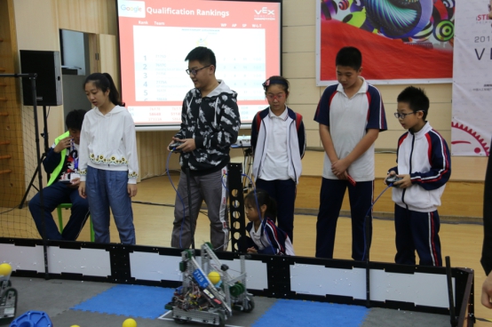 检录完,上午十点至十一点为技能挑战赛时间,各战队开始排队炫自己的技术,在机器人技能挑战赛中,每次一台机器上场,一台机器人获得尽可能高的得分,包括了自动程序与手动控制得分,我校7175B战队以3分之差屈居第二。
