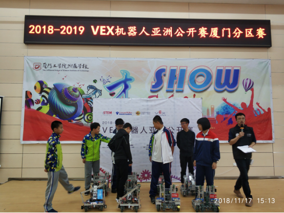 11月17日星期六,2018-2019赛季VEX机器人亚洲公开赛——厦门分区赛在我校吹响比赛的号角。据了解,VEX机器人世界锦标赛每年有数百万青少年参与选拔,是目前全球影响力最大的机器人赛事之一。本场比赛由中国人工智能产业发展联盟作为战略指导单位,厦门工学院附属学校承办,厦门科技馆协办。