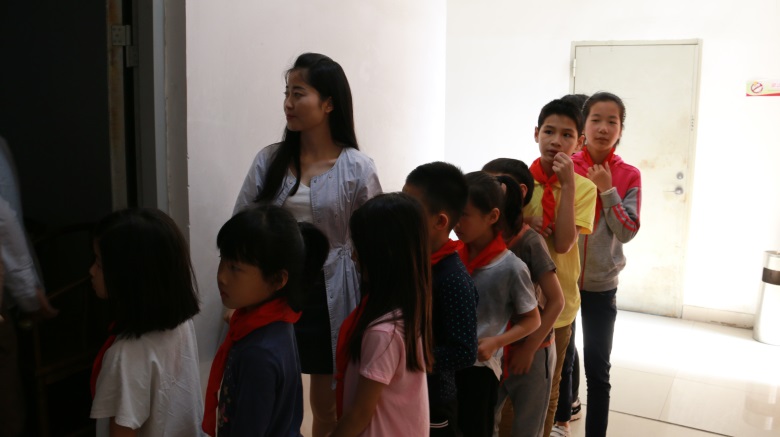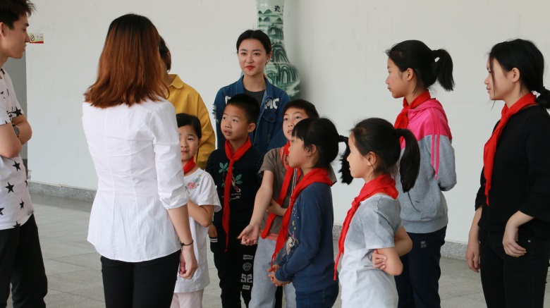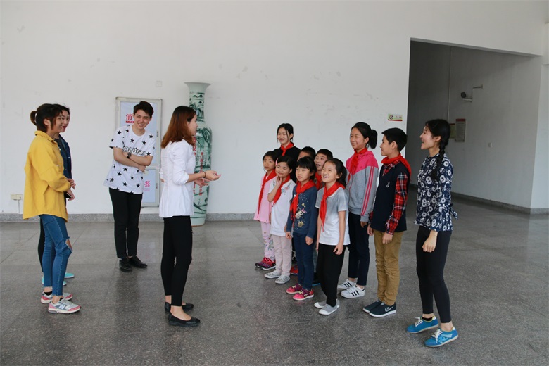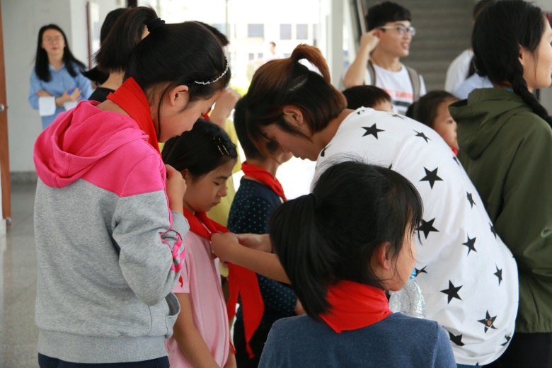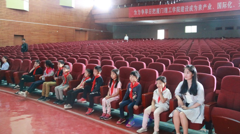比赛前的紧张准备,厦门工学院的大学生们为我校小学生佩戴好红领巾,准备好道具,并进行谢幕的排练。