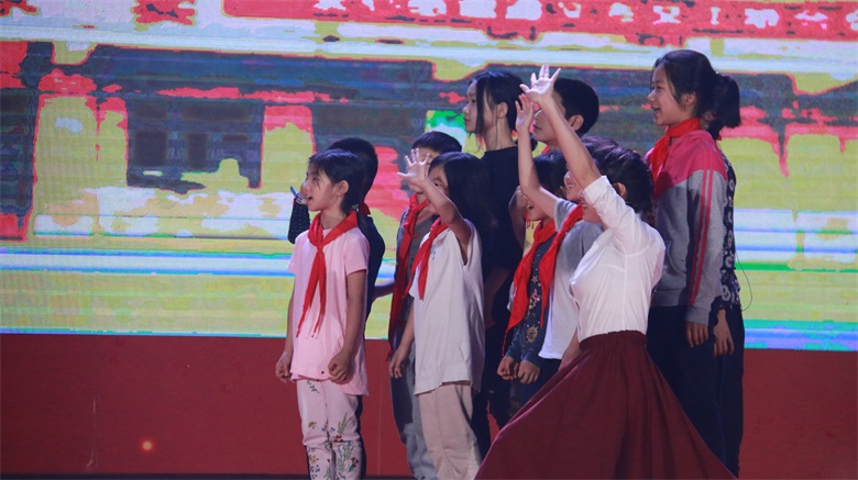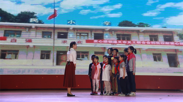 我校学生在舞台合唱歌曲“虫儿飞”,演绎留守儿童对生活的期待,表现留守儿童对知识的渴望。