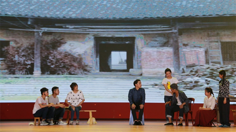 厦门工学院附属学校学生进行戏剧课程实践,参演戏剧“留守的天空”,并随剧参加了第二届福建省大学生戏剧节,图为厦门工学院大学生与我校学生共同探讨戏剧表演,进行的戏剧排练。