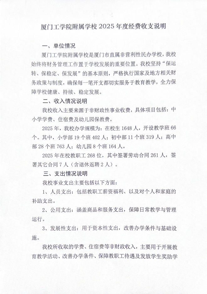 厦门工学院附属学校2025年度经费收支说明