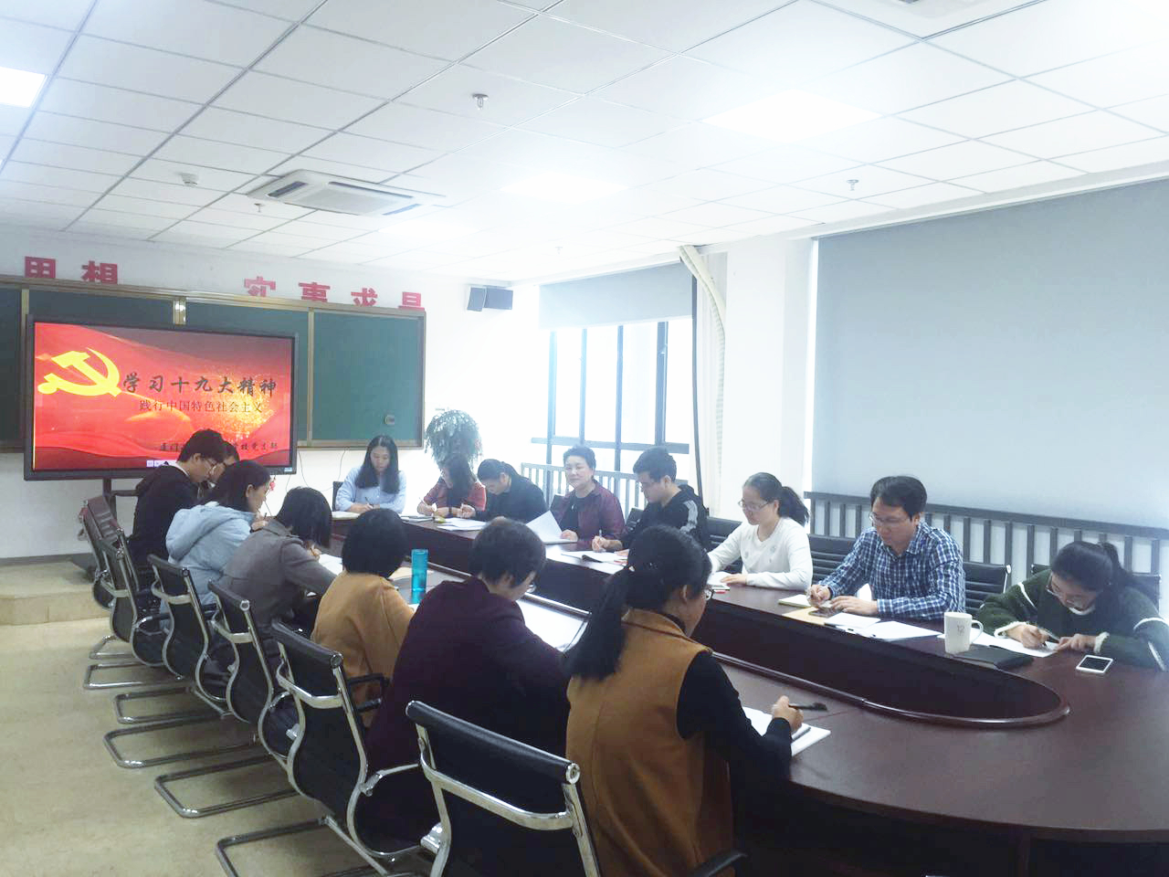 党支部书记赵继容同志首先结合我校工作实际,指出学习十九大精神关键是要把大会确定的目标任务落实到党员干部的行动上、落实到推动我校教学工作和教育管理的实践中。其次,她强调全体党员干部要紧密结合工作实际,认真研究并制定具体举措,创造性地贯彻落实大会精神,将其转化为推动我校创先争优新跨越的强大动力。最后,赵继容同志组织与会人员学习了习近平同志在中国共产党第十九次全国人民代表大会上题为《决胜全面建成小康社会 夺取新时代中国特色社会主义伟大胜利》的报告,并组织大家学习中国共产党第十九次全国人民代表大会审议并一致通过的由十八届中央委员会提出的《中国共产党章程(修正案)》。她要求大家要及时关注并学习大会精神,深入学习和广泛宣传,切实把学习贯彻十九大会议精神作为当前和今后很长一个时期的重要任务。党支部组织委员谢丽珍同志与党支部宣传委员戴冀同志就他们学习十九大报告精神及《中国共产党章程》的心得与全体党员做了深入交流。