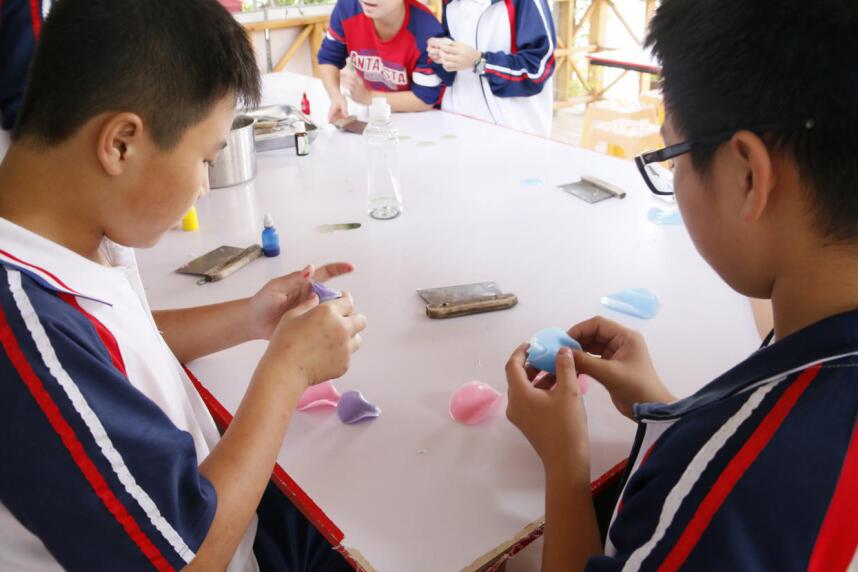 中学部同学的社会实践内容之一是制作手工皂。农场老师与学生进行互动,并详细讲解做手工香皂需要哪些材料,手把手教学生制作香皂。要想完成DIY手工皂的制作,首先要把做好的皂切丁融化,添加精油和色素,然后在桌上滴六片圆形的融化好的皂,待冷却后,用手捏形,一片裹着一片,做成一朵淡雅的玫瑰,最后在它的周围再铺上一层融化后透明的水晶皂。做一块香皂,看似简单,其实可不容易了,每个步骤都要很细心,很认真。