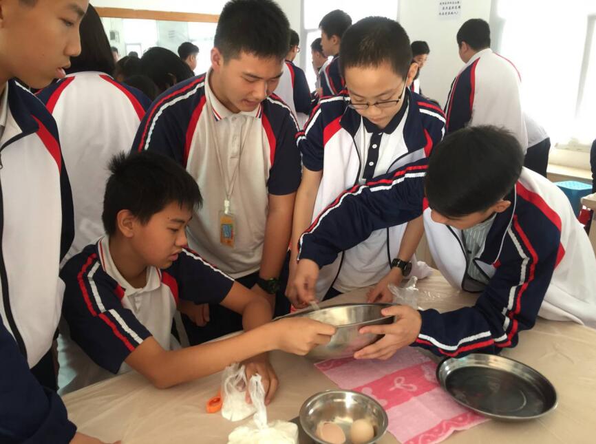 自己动手,丰衣足食。中学部学生走进糕点制作房,学习制作南洋糕点——蝴蝶酥。同学们对制作过程充满好奇,时而频频点头,时而若有所思。听着老师的介绍,同学们迫不及待地制作起糕点来。大家按照七人一组自由组合,在老师的指点下,打散鸡蛋、加入糖粉搅拌、放入猪油、擀面、切块、打洞,一道道工序井然有序地进行着,同学们相互合作,很快做好了蝴蝶酥。自己做的东西吃在嘴里,就是那么甜。
