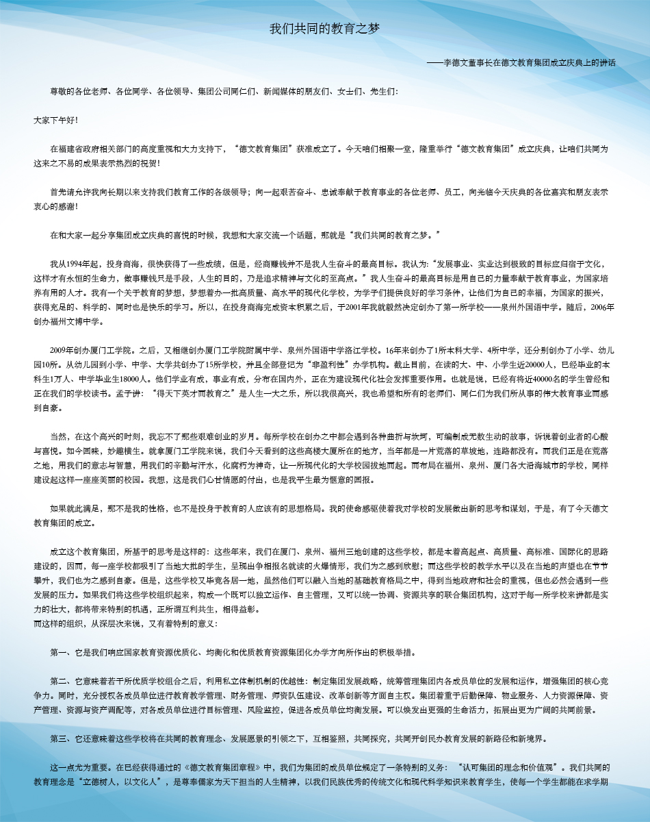 德文教育集团将以“立德树人,以文化人”为共同教育理念,以“百年树人,百年名校”为共同愿景,以奉献教育事业为共同价值观,力争把集团所属的每一所学校办成一流名校。