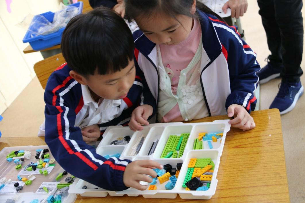 小朋友们认真研究乐高机器人组装的模块
