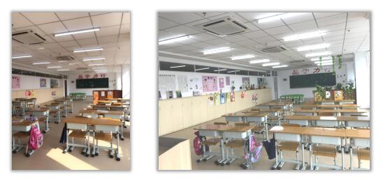 其次,功能分区的大教室,具有生命气息和成长性。学校把两间教室并作一间,一、二年级的教室空间达到120平米。在这样的教室里,不但实现了把更多的教育资源直接放到孩子身边的目标,而且让教室功能分区成为现实:活动区、休闲区、阅读区、观察区。这样的教室更像是一个集体大书房,四处贴满了各式可爱的卡通图案,也根据课程变化不断更换孩子的作品,教师外面的黏贴墙上,也都是孩子的作品,让学校的墙壁也说话,见证孩子们的成长,收获快乐。教室里有衣柜,用来放学生的书包及书籍。学生的学习档案,固定用的学习工具,课外书也都有序地摆放在教室的一角。