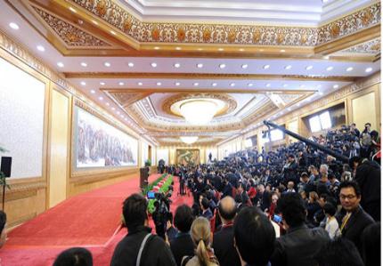 东大厅内,华灯璀璨。一面鲜红党旗醒目地竖立在主席台一侧。500多名中外记者已经在会场内等候。他们有的提前2个多小时就赶到这里,架起摄影机、照相机,打开电脑、录音笔,希望在这场举世瞩目的新闻报道中抢得先机。