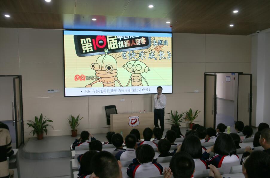 何广福老师通过播放机器人竞赛的主题曲,揭开了本次讲座的序幕,将自己“愿所有怀抱科技梦想的孩子都能快乐成长”的愿景寄予悠扬的歌声之中。