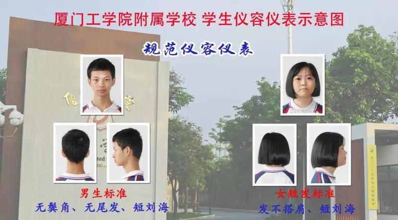 男生发型:前面不得遮眉,侧面不得盖耳,后面不超过发际。不准染发、烫发、剪怪发。