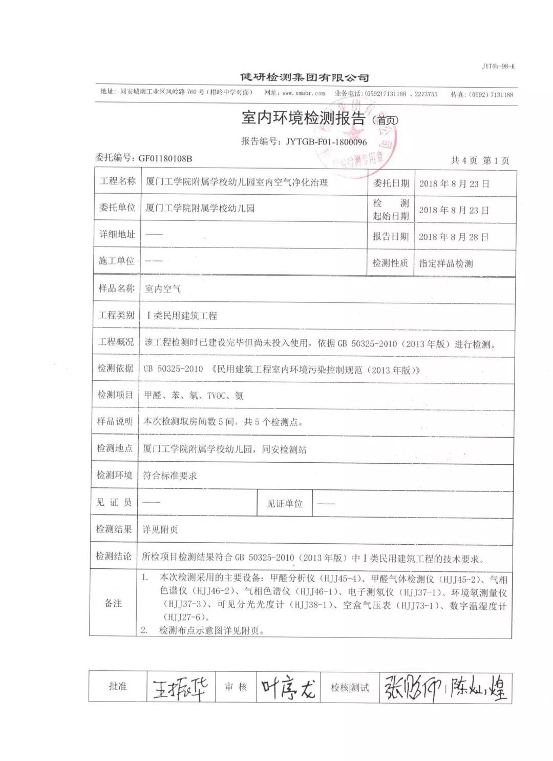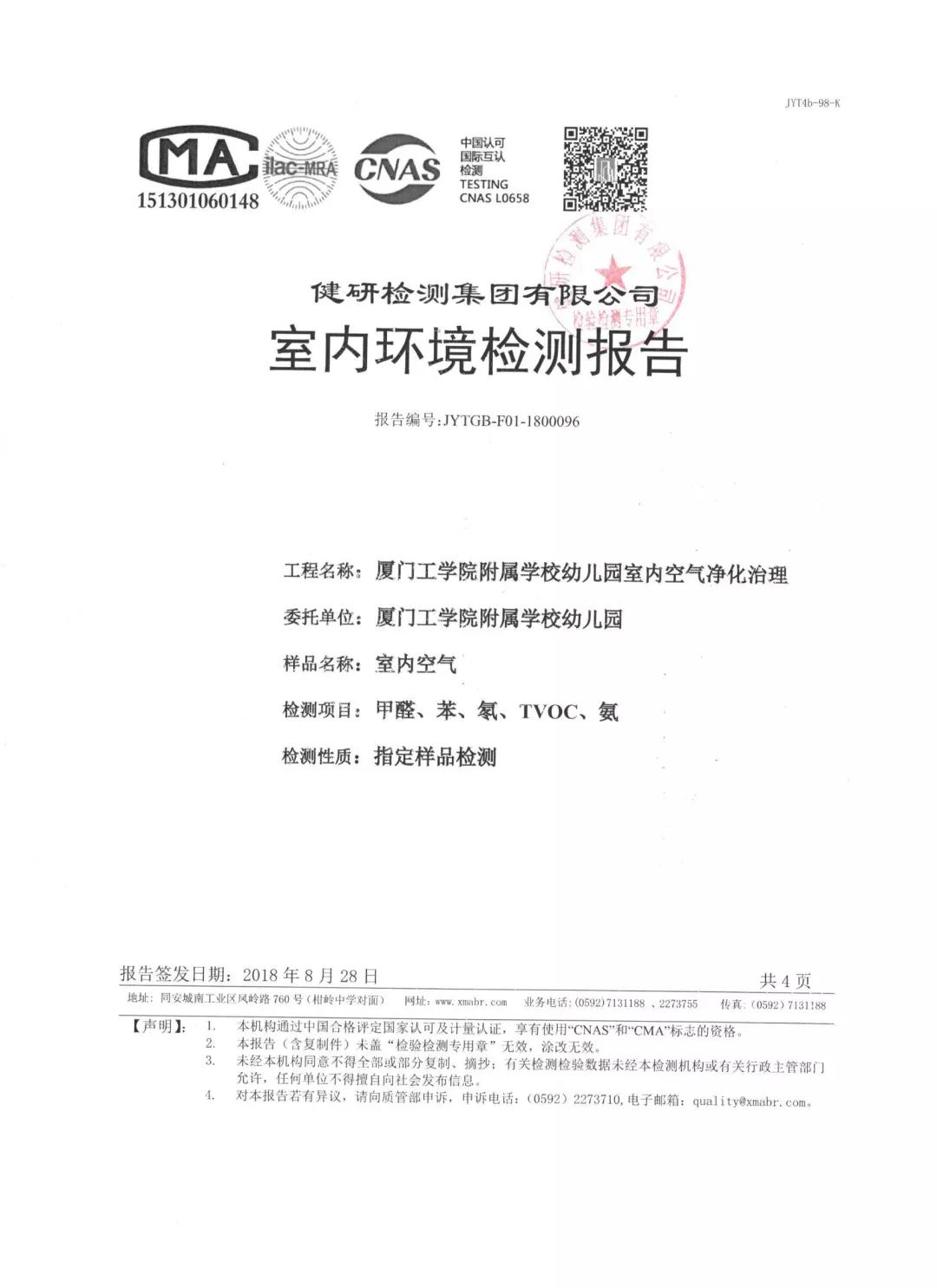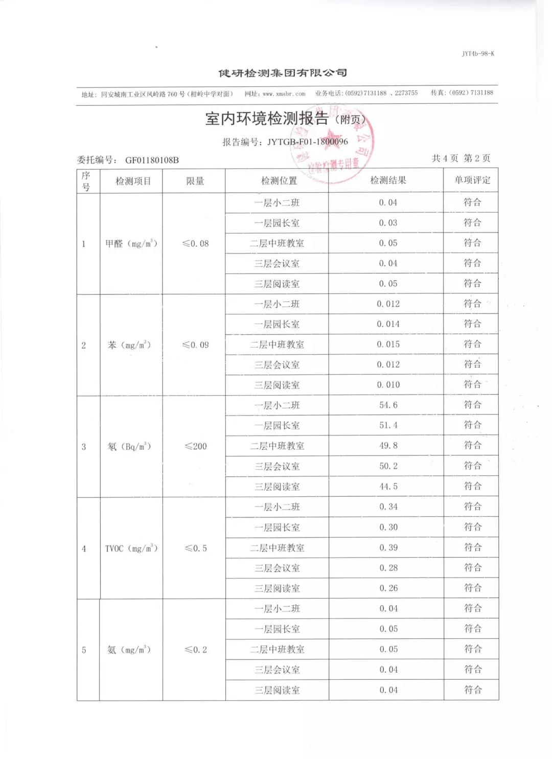 近日,本园在全封闭环境下进行了多次检测,将结果送检国家第三方机构验收测评并出具了空气质量检测报告,甲醛含量结果达到国际E0级环保标准。这是什么概念呢?成品甲醛含量≤0.5mg/L,国际至高安全标准,哪怕是小Baby也能放心托付哦。