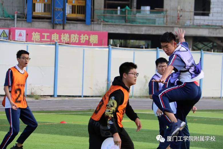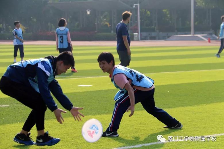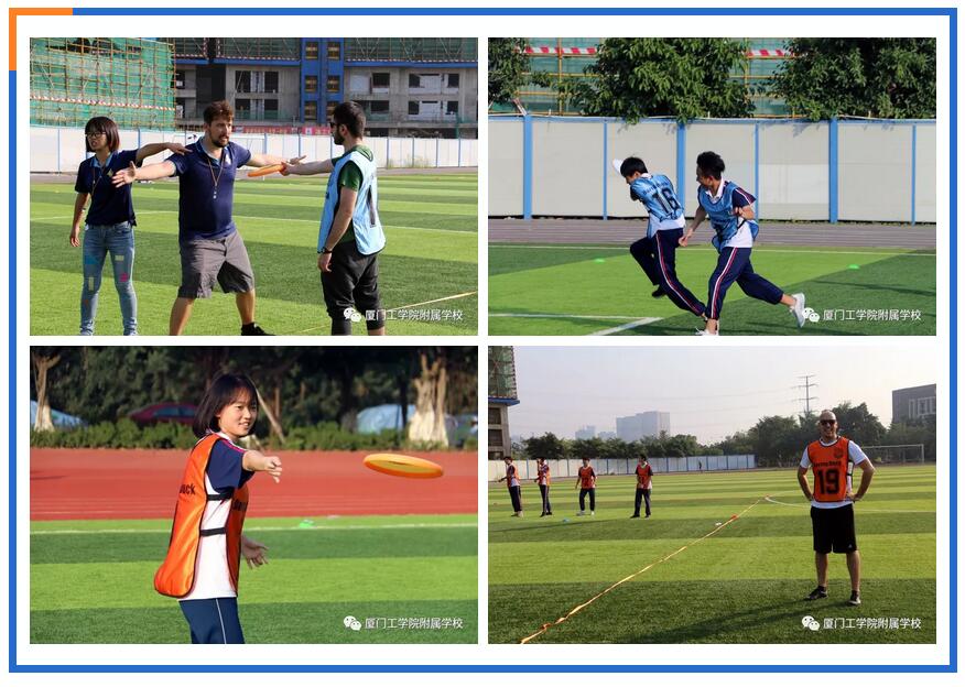 在极限飞盘部分,外籍教练们非常细致和耐心地解说了飞盘这项运动的来源及玩法,这是一项严格要求无身体碰撞的对抗型竞技运动,起源于1968年美国新泽西州,2001年列入World Game(世界运动会)项目,是一项融合了橄榄球、足球和篮球等运动特点,男女可以共同竞技的团队运动。学生们在初步练习后, 10人一队相互PK,主要讲求的是队员们之间的默契与配合。几轮下来,大家兴致高昂,场外的外籍老师们担当“教练”的角色,指导自己队的同学跑位拦截拿分。