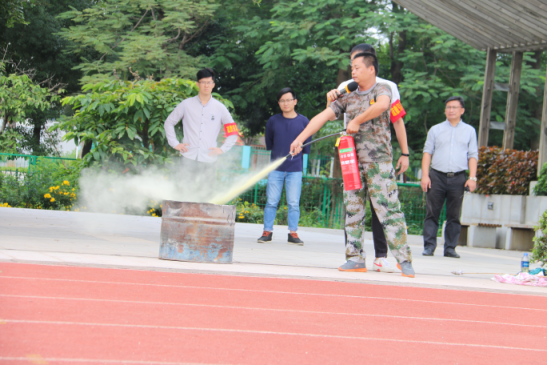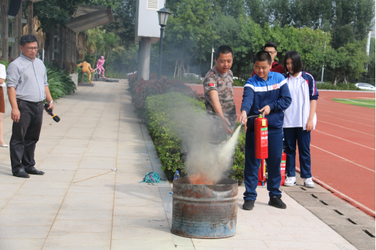 同学们在教官的正确引导下,认真学习使用灭火器