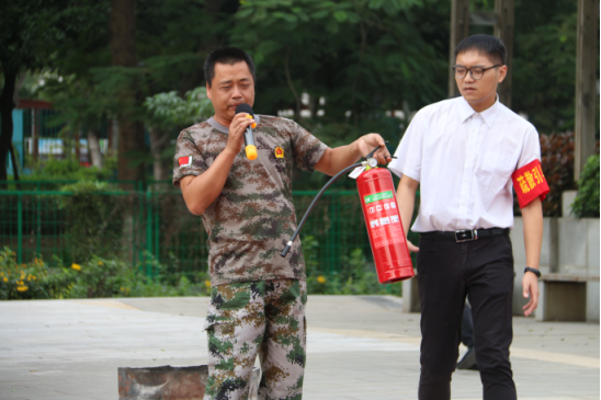 教官给予同学说讲解灭火器的正确使用方法及灭火器的常规安全检查知识,并对如何使用灭火器做示范
