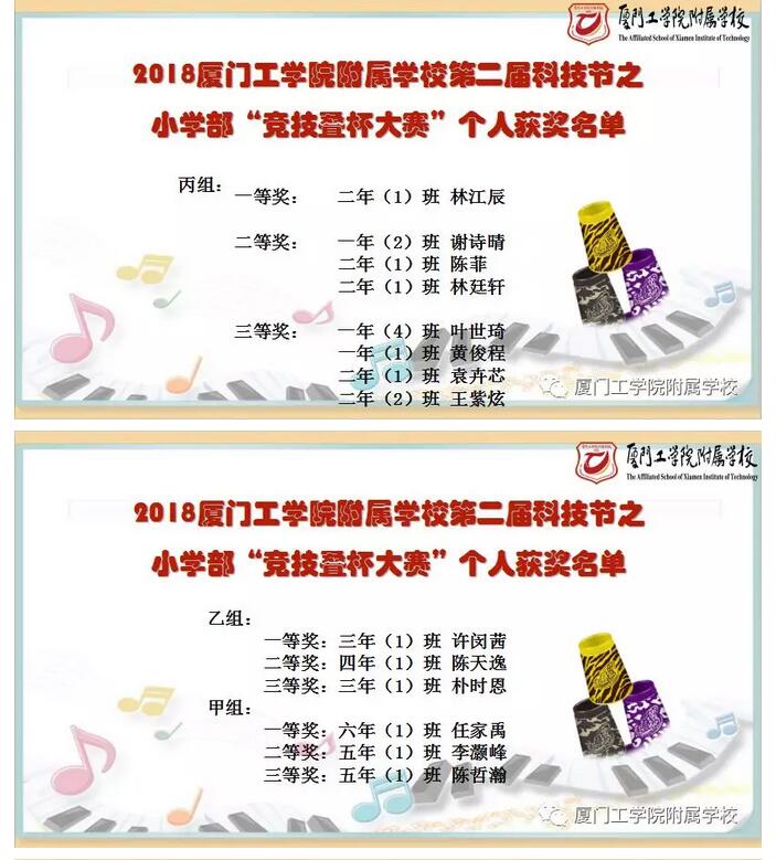 最后,二年(1)班、四年(1)班和六年(1)班分别获得此次小学部叠杯竞技团体接力计时赛甲、乙、丙组的冠军。