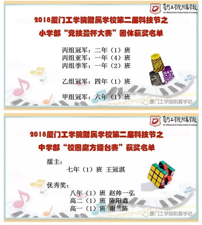 经过一番激烈的角逐,最终小学部六年(1)班任家禹、三年(1)班许闵茜和二年(1)班林江辰分别摘得本届科技节小学部竞技叠杯比赛甲、乙、丙组的桂冠。