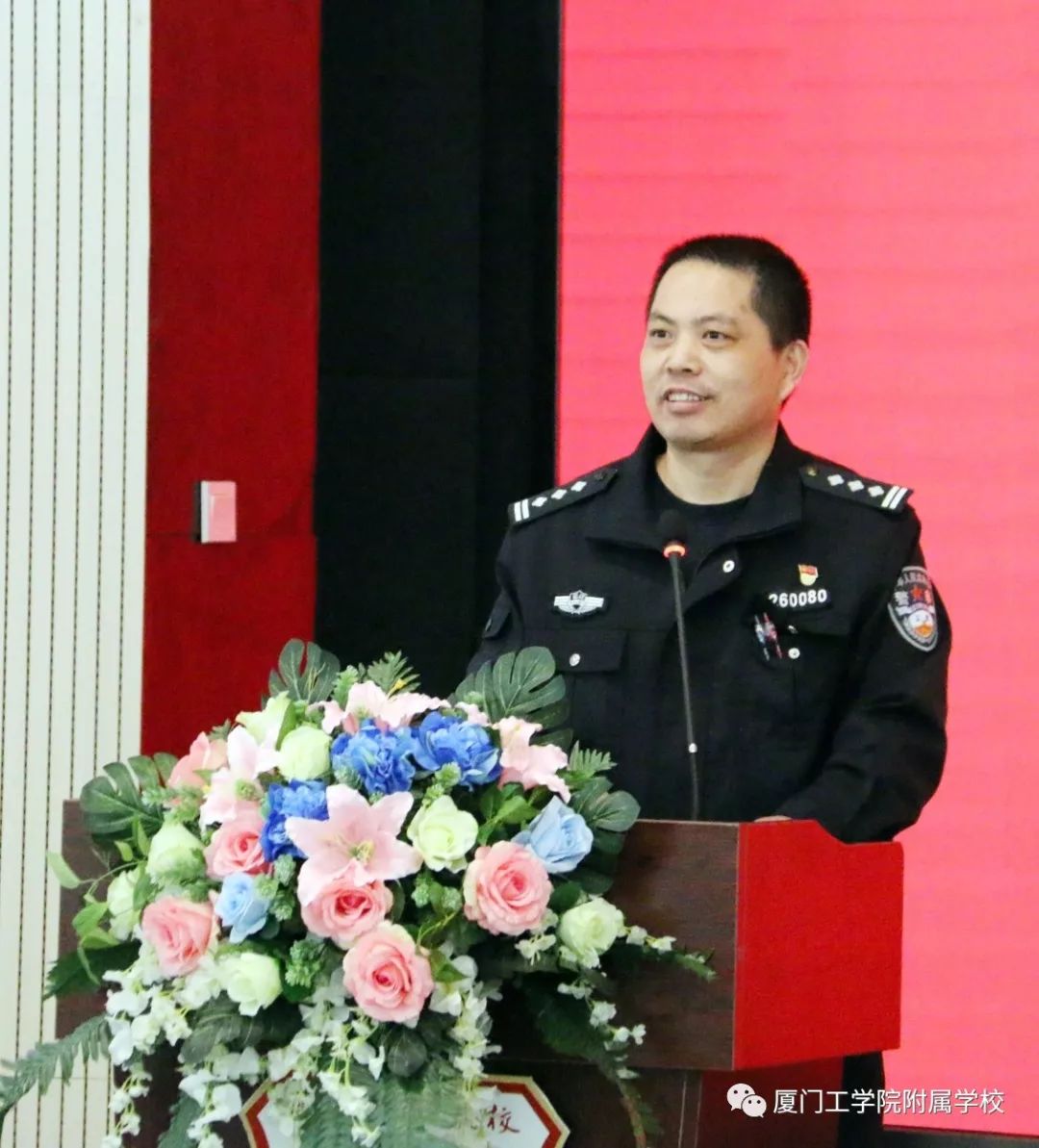 法制在我心,平安伴我行。在闭学式的最后,厦门工学院附属学校综治副校长朱仕灶警官为高中部师生进行了寒假法制安全宣传教育,朱警官结合近年来的一些案例,告诫大家增强法制观念,提高自我保护能力,教育大家要养成良好行为习惯,要坚定地认识到只有珍爱生命,我们才能去追求、去梦想、去快乐、去幸福!