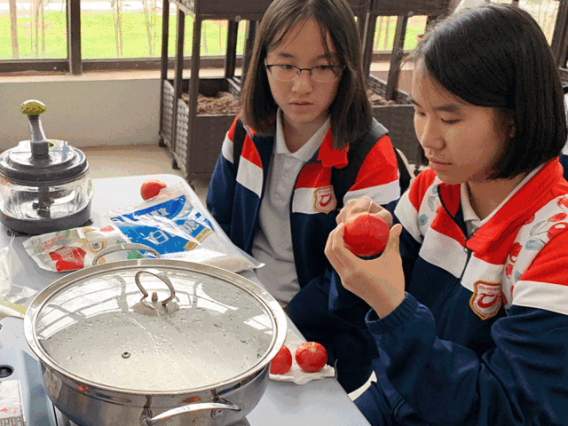 走出蔬菜大棚的同学们都是收获满满,带着他们的收获,开始了今天最重要的一项任务——制作番茄酱。烧水,煮西红柿,剥皮,切块,用搅拌机搅碎,熬制番茄汁,加配料,等待冷却,装罐。在工作人员耐心的指导下,同学们有条不紊地操作着,不一会儿,自制番茄酱就大功告成了。
