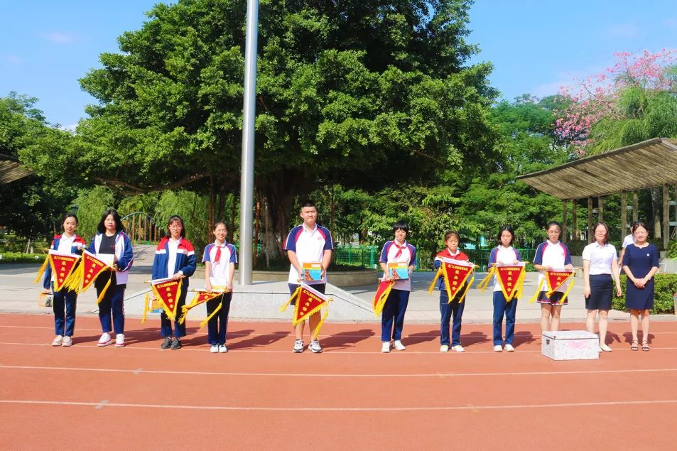 在全校升旗仪式中,校领导隆重为获奖宿舍颁发锦旗及奖品。
