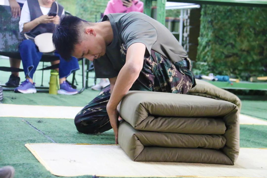 内务整理是军人的必备技能。教官们耐心教导,一点儿也不带马虎;“战士们”上手很快,叠出来也都有模有样的。