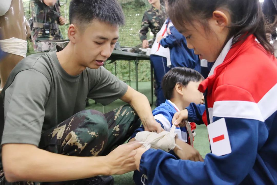在“战地医院”学习包扎“伤口”、快速逃生、野外隐蔽……各种实用技能教学也令同学们收获满满!
