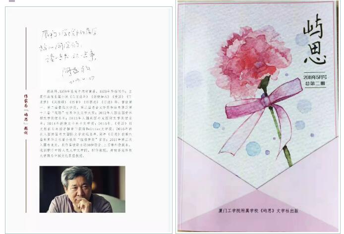 教育使人富有,文学使人高贵。正如白烨先生所言:“文学是人生的压舱石,而校园文学是青少年成长路上的加油器”,学生是未来的公民,校园文学恰恰是以他们为中心,面对“立德树人”的教育使命,“屿思”文学社责任重大、任务艰巨。漫漫“树人”路,我们更当与大家继续共同努力,积极地推进校园文学与学校文化的结合、校园文学与课程教学的结合,勇担“立德树人”使命,共谱“以文化人”新篇!