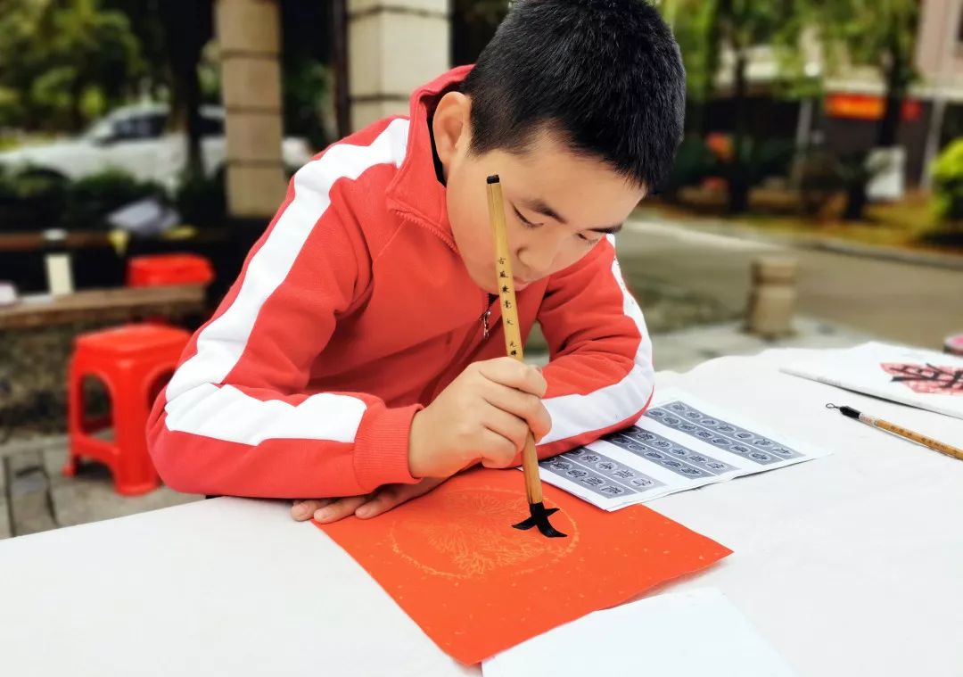 上午八点,在厦门工学院艺术学院曹鸣喜院长与我校小学初中部周志高校长带领下,十多位师生早已各就各位,笔墨纸砚摆放得整齐有序。小书法家们现场挥毫泼墨,准备将这些墨迹凝结成的吉祥祝福,送给前来领春联的社区居民。
